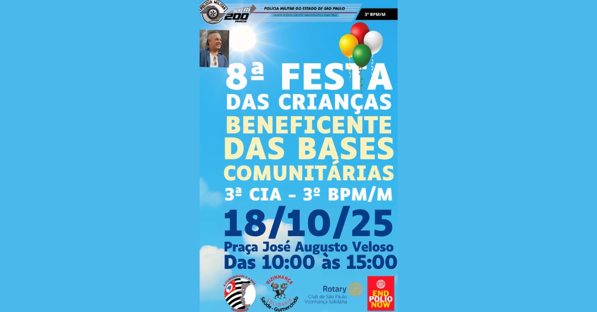 No dia 18 de outubro de 2025, a Polícia Militar do Estado de São Paulo, por meio da 3ª Companhia do 3º BPM/M, realiza a 8ª Festa das Crianças Beneficente das Bases Comunitárias, um evento tradicional que transforma o mês das crianças em um momento de união, solidariedade e muita diversão.